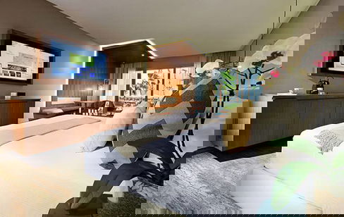 Descansa profundamente en estas nuevas suites con una cama de matrimonio king size o dos individuales full size, con colchón 'efecto memoria' y menú de almohadas incluido. Disfruta de la tecnología con su TV de pantalla plana de 50', conexión WiFi y estación para Ipod/Iphone, y relájate en la bañera de hidromasaje, la terraza o en su confortable sofá cama. Dispondrás de multitud de amenidades que completarán tu experiencia como minibar, albornoz y zapatillas, accesorios de baño, facilidades para café y té…